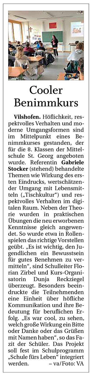 Metten. Frau Knigge-Expertin Gabriele Stocker hat die siebte Klasse der Mittelschule in Metten besucht. Der Workshop sollte die Schüler auf den Eintritt in das Berufsleben vorbereiten und ihnen durch mehr Wissen Selbstbewusstsein und Sicherheit vermitteln [Lesen Sie mehr im Artikel].